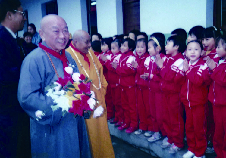 1994年新洲報恩寺開光前師父和美國泉慧法師到學校受到學生歡迎
