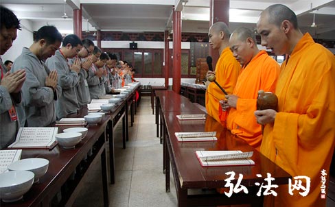 每天早上5点30分学员就起床,在组长的带领下准备用早餐,进入斋堂时学员们按照义工的指示排班坐好,跟随法师一起恭诵《大方广佛华严经普贤行愿品》。诵经完毕,开始过堂早斋。