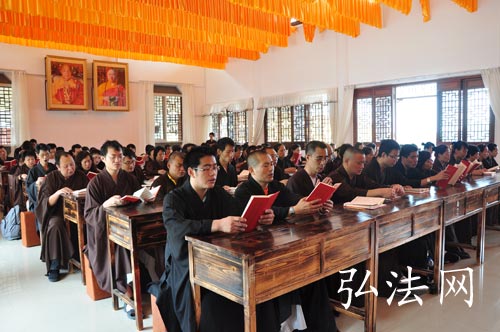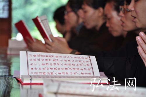 10月10日(星期日),本焕弘法学院历届八关斋戒之戒子110余人,应“请佛住世共修会”之倡导,一早就来到弘法寺,心一起愿一起,共同讽诵《普贤行愿品》。七楼教室里座无虚席,下午三时后仍不断有人加入诵读。人人一本本老刺血恭书的《普贤行愿品》在手,欢喜至诚诵读。