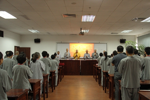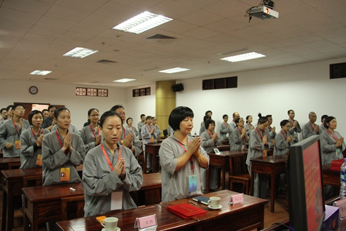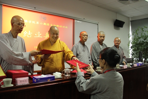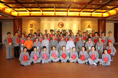 印顺大和尚非常关心居士培训班的进展,于百忙中赶来参加典礼并亲自为学员颁发结业证书。他说,“今天是重阳佳节,预示着我们每个人都将登高望远,此生有幸走入佛学大海,就是开始了登高望远的生命新历程。希望大家回去后不仅要将所学所感实际用起来,把学佛的志向、愿力与此次获得的学修习惯在生活中坚持下去,不断良性循环,在浮躁的世界中获得清凉;还要不做自了汉,发大愿,发菩提心,长久心!希望每人能带动周围三个人来共同体悟佛法清凉,开始新的生命旅程,让世界更美好!”