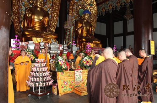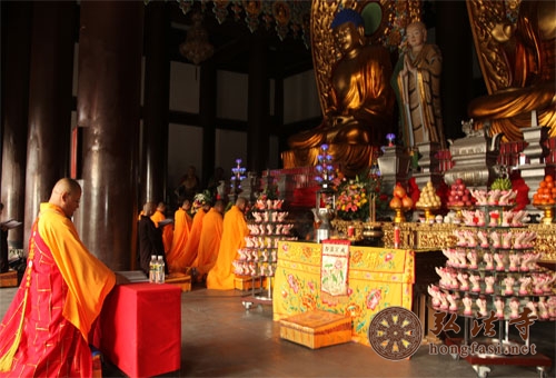 上午8:30,由南山寺首座智法师主法,率领全体僧众及各方护法居士于金堂虔诚礼拜《慈悲三昧水忏》,祈求仗佛慈力,悯念轮回受苦众生,超越恶道,得生净土。僧众各自忏悔发愿,早日脱离六道,圆满菩提,并祈福风调雨顺,国泰民安,政通人和,物阜民康。
