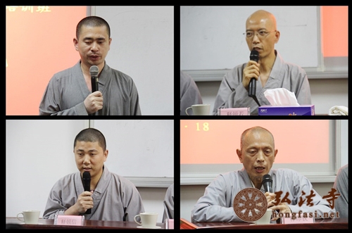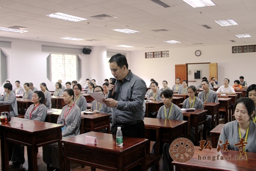 开学典礼上,本期居士培训班班主任来定法师首先向学员介绍了弘法寺佛学院培训班的概况及宣读了培训班宗旨。他希望在培训期间,学员们能够放下万缘,吸取佛法甘露,通过这个非常宝贵的了解佛法的渠道,把握好当下的因缘,学有所得,满载而归。