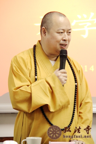 2014年4月18日上午8点,弘法寺佛学院在学院第四课室举行了第七期居士初级培训班开学典礼。中国佛教协会副会长、海南省佛教协会会长、深圳弘法寺方丈印顺大和尚参加了此次开学典礼并作了开示。