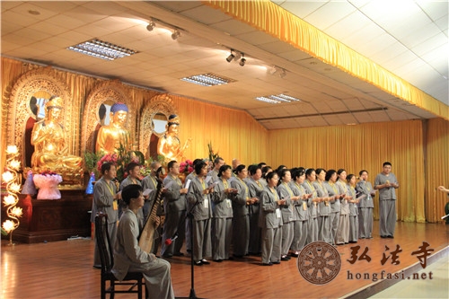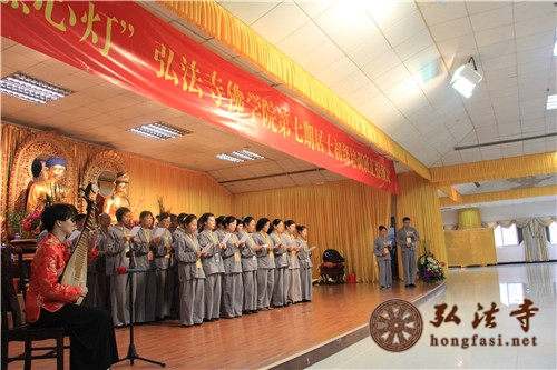 5月3日,弘法寺在经堂举行了第七期居士培训班汇报演出。一曲琵琶独奏《春江花月夜》,让人飞向心灵的净土;琵琶伴奏男女合唱《三宝歌》、《燃灯之歌》,唱出了佛教的大气庄严;吉他伴奏小合唱《弘法寺的钟声》里,晨钟暮鼓唤醒多少作梦人;跨越时空的自编自创情景剧《三世情缘》,以一个顽石其三世演绎出一个令人笑翻的场景, 让人在大笑之余不禁领悟:是佛法,照亮了我们心,让我们精进修行,让我们一道奔向光明的彼岸。