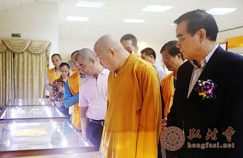 印顺大和尚、罗湖区统战部副部长、区宗教局局长李立笔在黄居士的讲解下欣赏展品