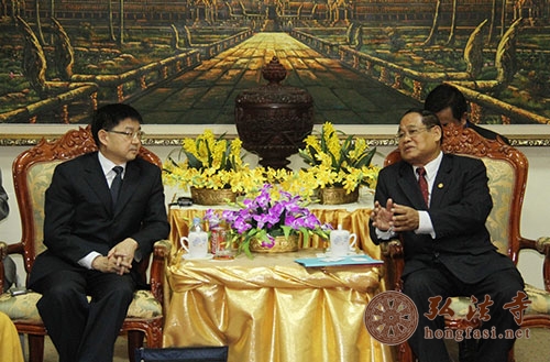 陈宗荣副局长代表团一行与柬埔寨宗教部部长孟肯阁下在柬埔寨国家宗教部大楼进行了会晤。孟肯部长代表柬方宗教人士对中方代表团的到来表示欢迎。他说中柬两国交流渊源流长,两国人民友谊深厚。尤其是2013年9月16日,应柬埔寨皇室的邀请,印顺大和尚赴皇宫为柬埔寨人民祈福消灾。柬埔寨副总理兼皇宫事务部部长关森沃亲王亲自迎接并感谢印顺大和尚前来皇宫为柬埔寨人民祈福消灾。同时也为柬埔寨国内局势回归和平而感恩大和尚的慈悲愿力,并期待迎请本焕长老舍利至柬埔寨永久安奉。他希望这种宗教交流活动需要一直持续下去,从而加强两国佛教交流。