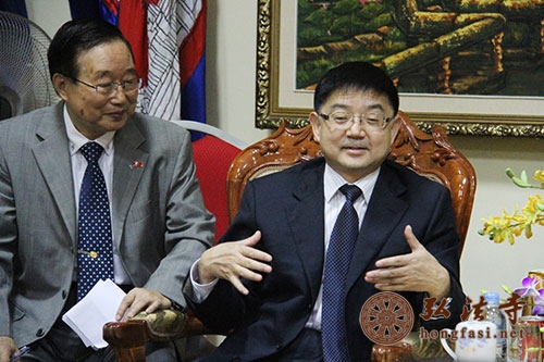 孟肯部长为陈宗荣副局长一行介绍柬埔寨佛教状况
