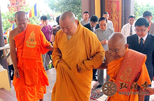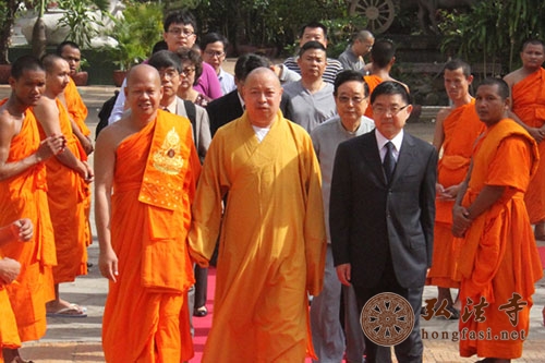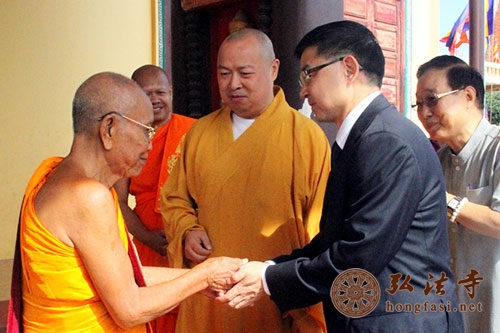 弘法网柬埔寨讯:2014年5月12日,由中国国家宗教事务局陈宗荣副局长率代表团一行分别与柬埔寨两大宗派的僧王进行会晤。中国佛教协会副会长、海南省佛教协会会长、尼泊尔中华寺、深圳弘法寺方丈印顺大和尚作为代表团成员参与此次会谈,受到了柬埔寨僧俗二众的热烈欢迎。