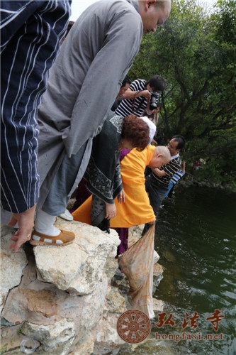 上午11点,放生法会开始。法师们、居士们、信众们齐聚白龙池共同参与放生法会,法会由印顺大和尚主法,大家跟随印顺大和尚虔诚诵念《放生仪轨》,在悲心切切的唱诵声中,为生灵们诵经、皈依、发愿、忏悔,祈愿生灵们早离恶道,得生人天,听闻佛法,离苦得乐。之后,在印顺大和尚带领下,大家一同把鱼类放生,被放生的鱼类顺着水流跃入白龙池,真正如鱼得水,自由自在。放生法会殊胜圆满,众多生灵得以回归自然,随缘往生。