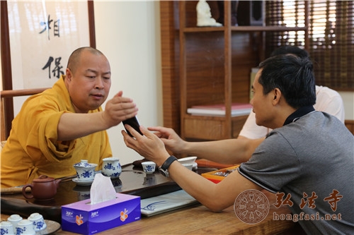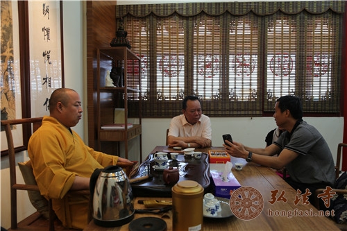 在弘法寺接待大厅,宾主喝茶品茗。海南省民族宗教事务委员会主任黄明荣和深圳市统战部副部长姚任跟印顺大和尚介绍了海南省佛教及深圳佛教的发展情况,与印顺大和尚共同探讨两地佛教未来的发展规划。印顺大和尚作为海南省佛教协会会长、深圳弘法寺方丈认真听取了情况,并发表了意见。