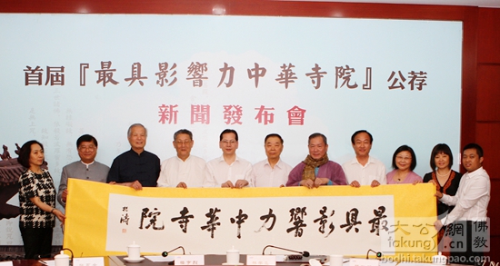 2014年6月9日上午10时,由大公报大公网发起,联合人民政协网等多家新闻机构举办的首届最具影响力中华寺院公荐活动正式启动。本次公荐活动将以梳理展现两岸四地寺院“文化特色”为核心,不涉及宗教教义教规等内容,通过公众推荐、专家评委点评等方式推荐出最具影响力的五十三家寺院。著名国学大师、北京大学宗教研究院名誉院长楼宇烈等来自海内外嘉宾云集北京,共同见证了首届最具影响力中华寺院公荐活动的启动。