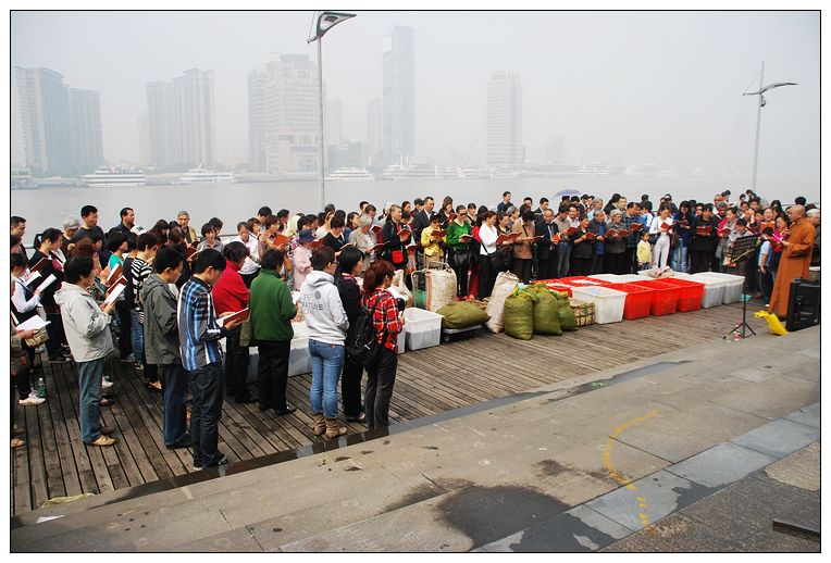 2013年5月11日,早上9点,阳光明媚,在浦东杨家渡渡口举行了5月的放生活动。阳光热烈,来放生的善信们也热情似火,大约有300名大菩萨参加此次放生。本次放生法会,在本源师父的引领下,依照放生仪轨,如理如法念诵相应的经文,祈祷众生吉祥,世界和谐。