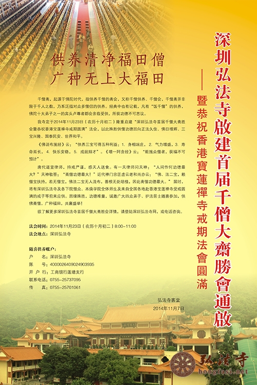 我寺定于2014年11月23日(农历十月初二)隆重启建“深圳弘法寺首届千僧大斋胜会暨恭祝香港宝莲禅寺戒期圆满”法会,以此殊胜供僧功德回向正法久住、佛日增辉、三宝兴隆、国泰民安、世界和平。