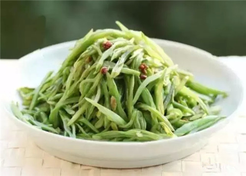2.锅烧热下少许油,下花椒粒小火至香气出来,下入切好的扁豆丝,中火不断翻炒豆角又生绿变翠绿然后变成橄榄绿,变软了,这样豆角都彻底炒熟了,加入盐糖生抽炒匀调味即可。