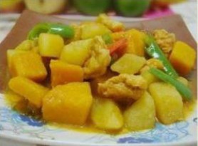 3、再放番瓜和大豆蛋白,并加酱油、盐、咖喱油,翻炒均匀,再次加入适量水(一次不能太多,否则会让菜失去香味),并盖上盖子继续焖至土豆和番瓜都熟透为止(喜欢烂烂的,就多煮些时间,中间如果烧干了就加水),快出锅前,放青红椒、蘑菇精,翻炒均匀,待锅中剩下少许汤汁后,出锅。