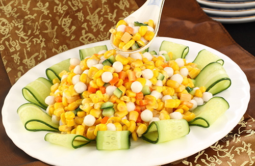4、起锅热油,爆香姜丝,倒入玉米粒翻炒,加入少许水煮两分钟左右,再依次放入香菇、花生米、大豆蛋白、黄瓜粒和小番茄粒继续翻炒、用盐、蘑菇精、少许白糖调味、最后勾薄芡,倒在刚才摆好黄瓜和小番茄的中间即可。