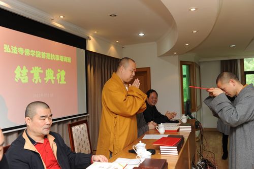 典礼由弘法寺佛学院校务总监刘玉民主持,副教务长宽江法师做了本期培训的总结,智空法师代表学员发言。罗湖区宗教局李立笔局长在发言中首先对学员结业表示祝贺,并向法师们寄语十二个字:“内强素质、外塑形象、担当责任”。因为这期培训班的学员都是来自各个寺庙的领导,李立笔打比喻说,要树立“我是服务员”的思想,服务僧众、服务信众,领导就是要为大家服务,希望大家以良好的素质和形象担起弘法利生的责任。
