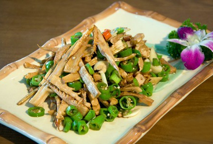 2、起锅热油,油略多些,倒入笋尖煸炒,边煸边淋些水,待笋煸至七、八成熟时,倒入酱油、白糖、蘑菇精调味,并放入菜椒,略炒后即可出锅。