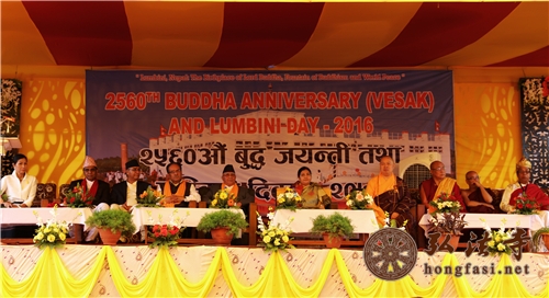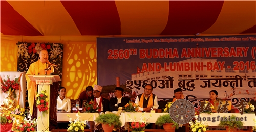 非常高兴能在纪念佛陀诞辰2560年这个因缘殊胜的日子里,和大家相聚在一起。一来到尼泊尔,人们就告诉我说,来尼泊尔要掌握一个自然规律。什么自然规律呢?就是2月份来的时候,这里的气温是20度,3月份来的时候,气温是30度,4月份来的时候,气温是40度,5月份来的时候,气温可能会达到50度。由此可见尼泊尔这个国家对待远方的来客是多么热情,感情是多么热烈。现在正值5月份,可是,为什么今天的气温却这么凉爽呢?我告诉诸位,这是因为昨天是5月20日,“520”的汉语谐音是“我爱你”。在这一天,无论是在中国,还是在世界上各地,有太多的人在说着“我爱你”,在表白着“我爱你”的故事。我想,这样的一天,一定也感动了佛陀,所以才有了今天这个无比清凉的日子。