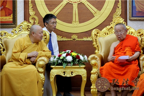 印顺大和尚说,无论汉传、南传,虽然僧衣的颜色不同,但对佛祖的敬信之心都是一样的。中老两国佛教与文化交流源远流长,日益频繁,两国人民情同手足。他向僧王介绍了南海佛学院的建设情况,指出南海佛学院将适应诸宗融通的时代需要,汉传、藏传、南传佛教并重,因此希望中老两国佛教通过这个平台,相互学习,相互借鉴。