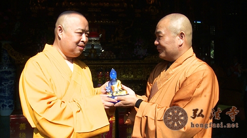 最后,秋风大和尚向印顺大和尚赠送“琉璃药师像”一尊,印顺大和尚回赠“佛门泰斗本焕老和尚”坐像与年谱,以此护佑昆山人民,并合影留念。(文/图:南海佛教)