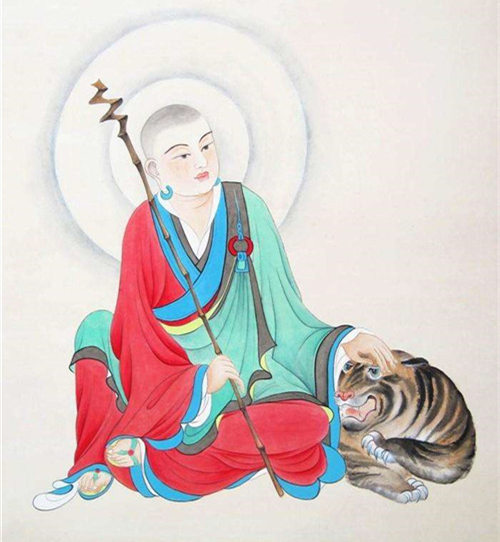 一天,这位苦行僧偶尔从树木茂密、遮天蔽日的一座大山中经过,突然发现一只吊睛猛虎雄踞道路正中,虎视眈眈,闪耀出森然博人的架势。环顾左右,绝无其他岔道可走。在这种进退维谷、走投无路的情况下,这位面目沉静的苦行僧却镇静自若毅然决然,敲打着木鱼,口中念念有词,向前走了过去……