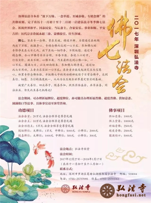 2018年1月17日,为期21天的弘法寺佛七法会进入最后一天。为普利亡灵,17日晚上6:00,弘法寺将启建圆满瑜珈焰口法会,以此殊胜功德回向世界和平、国泰民安;施主善信合家眷属消灾免难、福慧增长、身心安乐、如意吉祥、蒙佛加被、早证菩提。