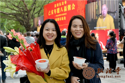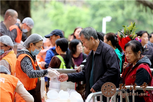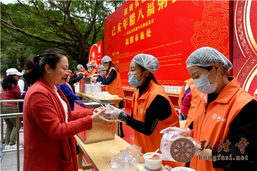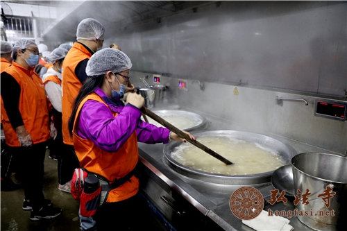 上午7时许,现场开始派发腊八福粥,大家满怀喜悦,感受腊八粥的吉祥和圆满。中午时分,腊八福粥一度供不应求,为保证每一个人都能吃到这一年一度的腊八福粥,弘法寺斋堂继续加班加点熬粥,普施数万份腊八福粥,以满足信众的需求。