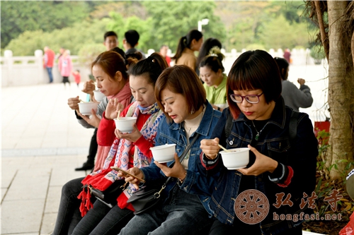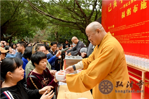 佛教传入我国后,各地寺院都会效仿牧女献乳糜事,以各种香谷果实煮粥,供佛敬佛,来纪念佛陀觉悟成佛这个特殊的日子。弘法寺自开山祖师、佛门泰斗本焕老和尚创建以来,每逢腊八这一天,都会精选食材,熬制腊八粥与善信结缘,以腊八施粥的传统方式,纪念伟大的佛陀成道,感念佛陀的慈悲和伟大,广布法喜。今天,弘法寺依然沿袭这一传统,将熬制成的腊八福顺佛粥,由法师和义工们递送到每一位前来的有缘人手中,广结善缘,带福回家,增福增慧。