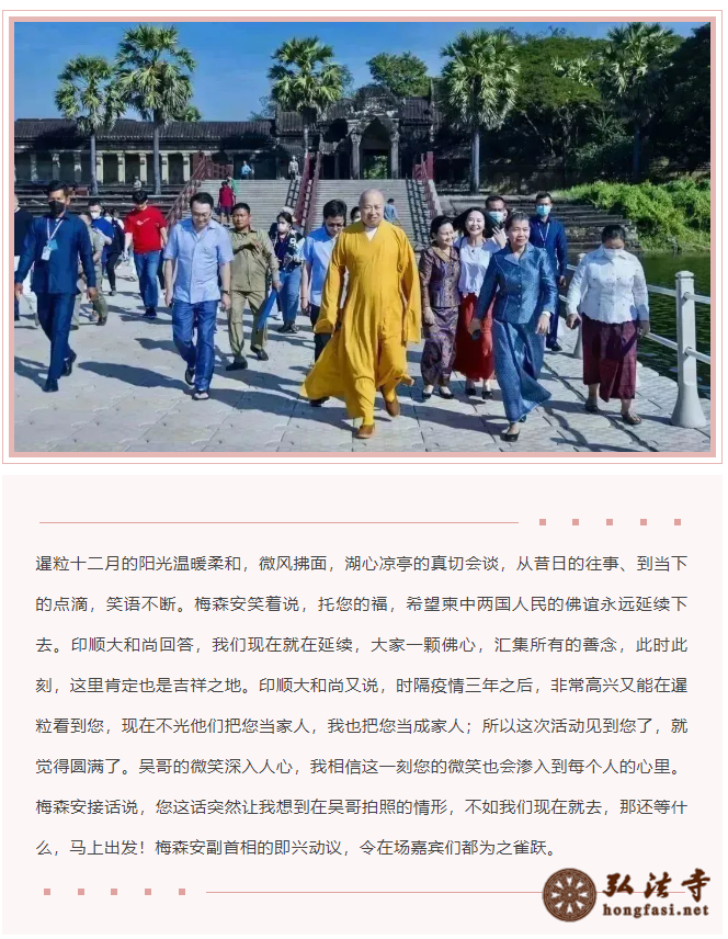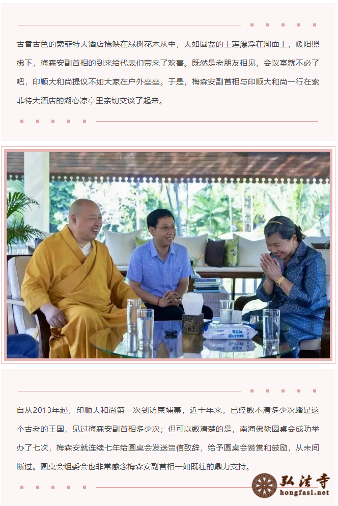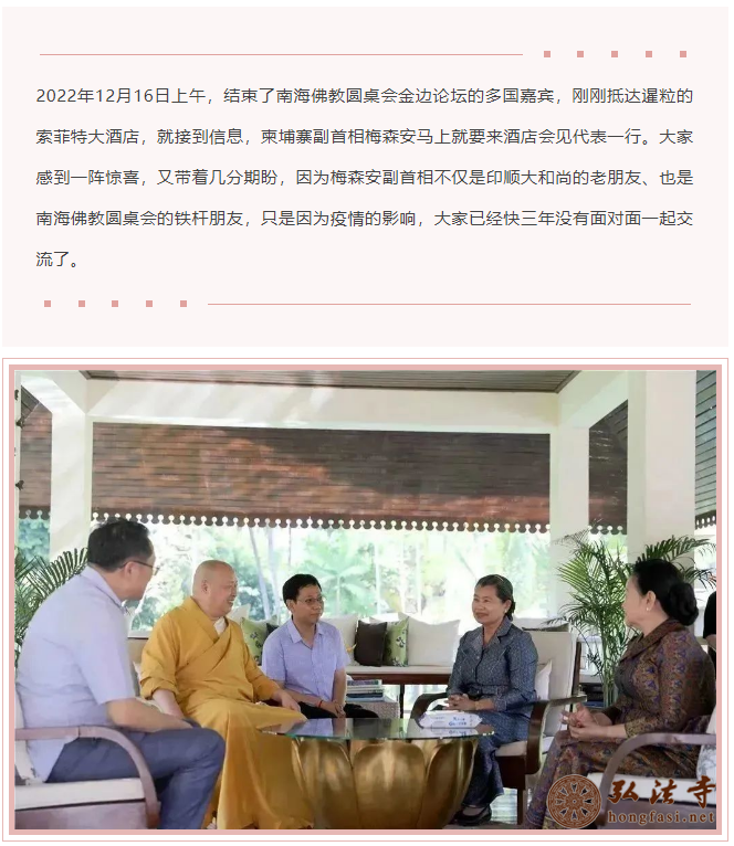 2022年12月16日上午,结束了南海佛教圆桌会金边论坛的多国嘉宾,刚刚抵达暹粒的索菲特大酒店,就接到信息,柬埔寨副首相梅森安马上就要来酒店会见代表一行。大家感到一阵惊喜,又带着几分期盼,因为梅森安副首相不仅是印顺大和尚的老朋友、也是南海佛教圆桌会的铁杆朋友,只是因为疫情的影响,大家已经快三年没有面对面一起交流了。